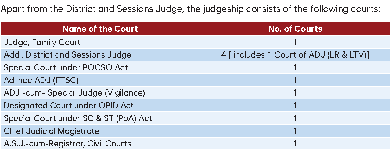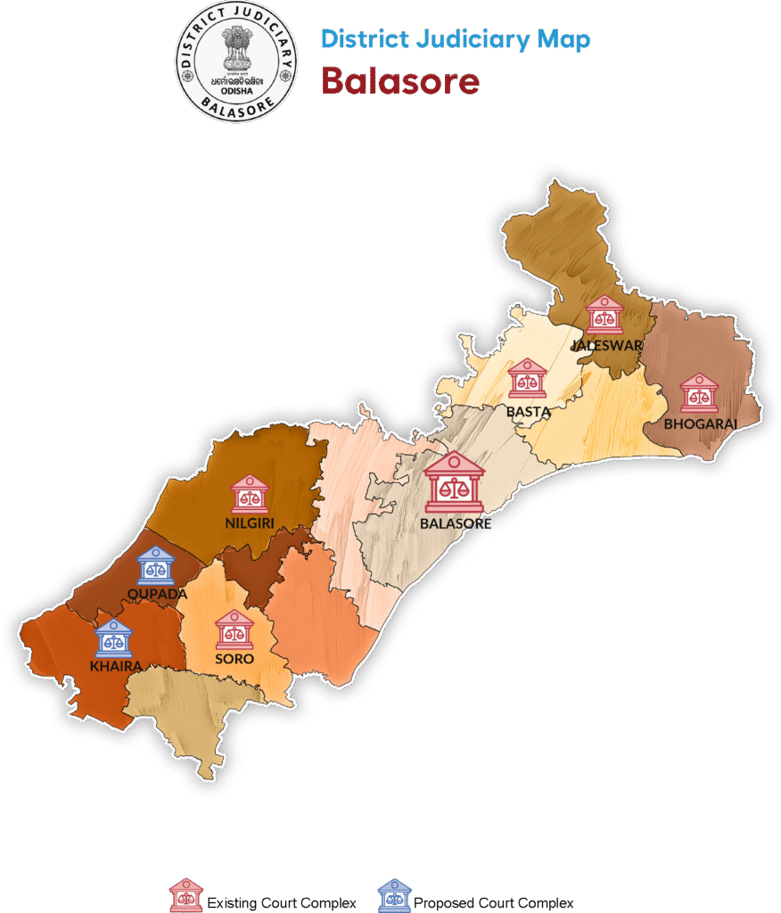 Till 1948, this judgeship was under the combined judgeship of Cuttack-Balasore-Sambalpur. After the merger of princely states in 1948, it came under Keonjhar judgeship. When the ex-State of Mayurbhanj merged with the state of Orissa in 1949, it remained under the Mayurbhanj judgeship with its headquarters at Baripada till 1949. The District Judge stationed at Baripada was holding a Circuit Court at Balasore from 1915 till 1957-58. A post of Additional District and Sessions Judge, Mayurbhanj was created in 1957-1958 with headquarters at Balasore. Balasore became an independent judgeship on 15th January, 1959. 44 different courts are functioning in this judgeship with outlying stations at Jaleswar, Nilgiri, Basta, Bhograi and Soro.