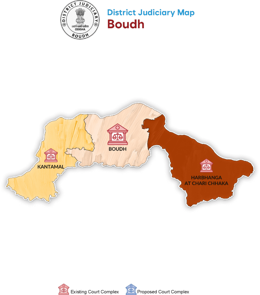 The Boudh judgeship was finally separated from Kandhamal-Boudh and began operating with effect from 6th October, 2012. 15 different courts are functioning in the judgeship with outlying stations at Kantamal and Harabhanga at Charichhaka.