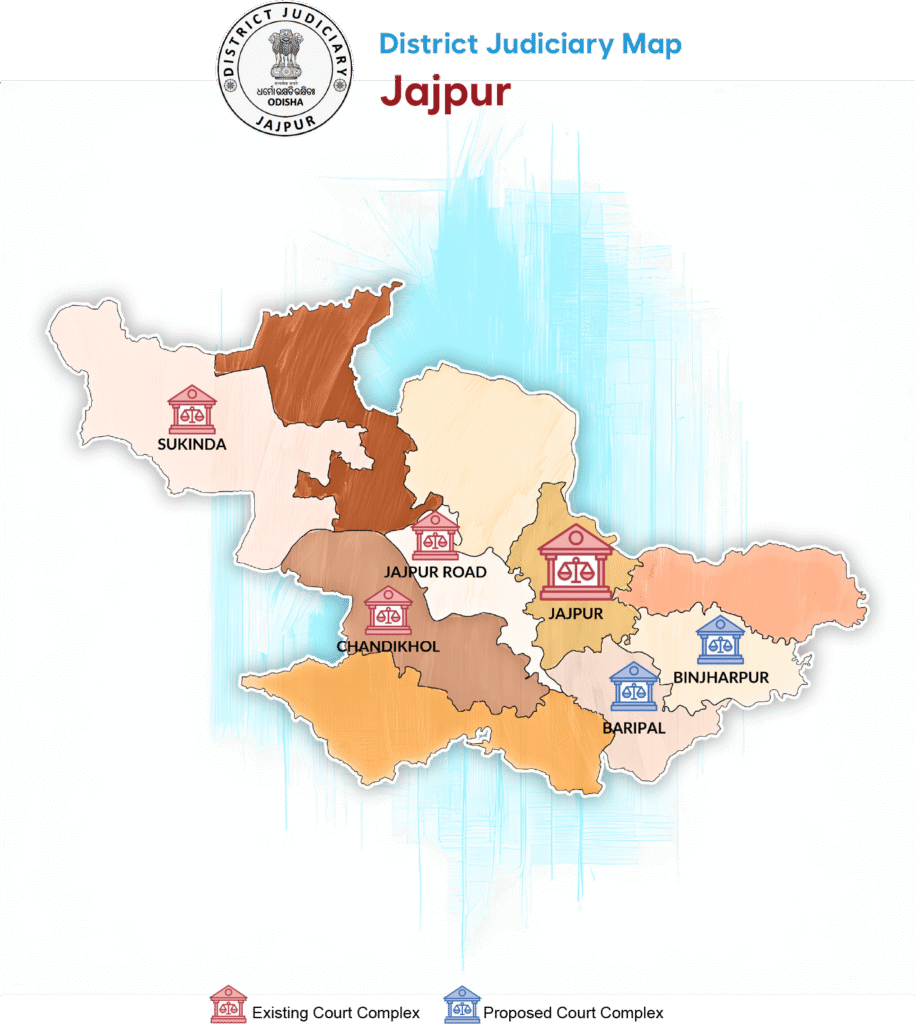 Jajpur Judgeship started functioning with effect from 28th June, 2012 after being separated from the erstwhile composite Judgeship of Cuttack, Jagatsingpur, Jajpur and Kendrapara. 27 different Courts are functioning in the Judgeship with outlying stations at Jajpur Road, Sukinda and Chandikhol. Since 2012, the Court of the District and Sessions Judge is functioning in a single storied old Town Hall, Jajpur having 6 rooms. The said building with an approximate plinth area of 2400 sq.ft. was constructed in 1933. The 12 other Courts of Jajpur are functioning in scattered buildings in the Civil Court Complex. Construction work for three numbers of non-residential projects and six numbers of residential projects at headquarters station Jajpur, three numbers of non-residential projects and five numbers of residential projects at Jajpur Road are going on.