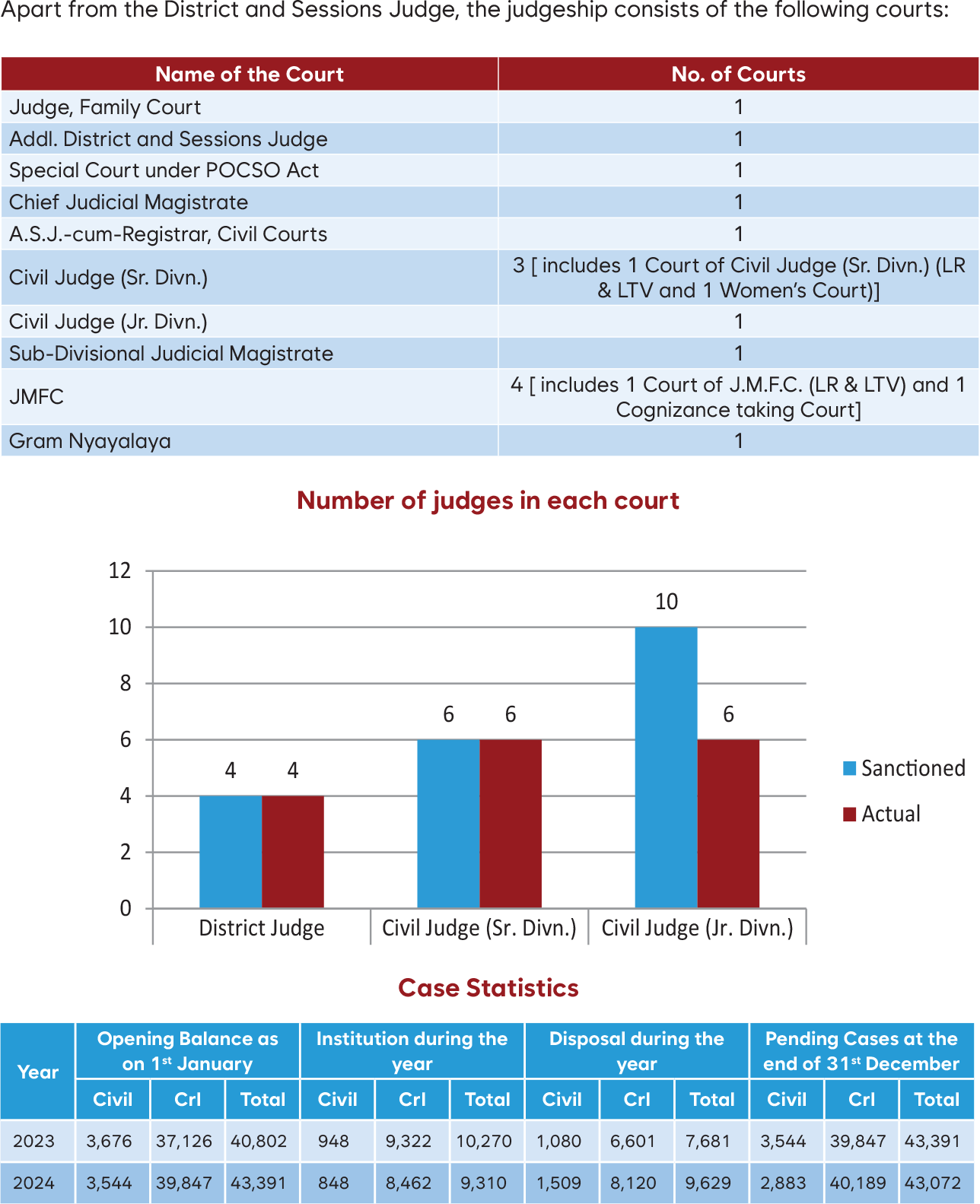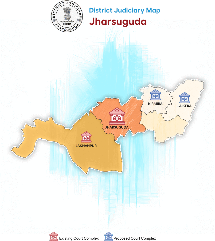 The Judgeship of Jharsuguda commenced on 24th November, 2011. Until 23rd September, 2011, it was under the jurisdiction of undivided Sambalpur. The District Court is functioning in a new building having 11 Courtrooms. The facilities available in the building include lift, ramp for differently abled persons, e-Sewa Kendra, and VC Cabin. 16 different Courts are functioning in the Judgeship with one outlying station at Lakhanpur.