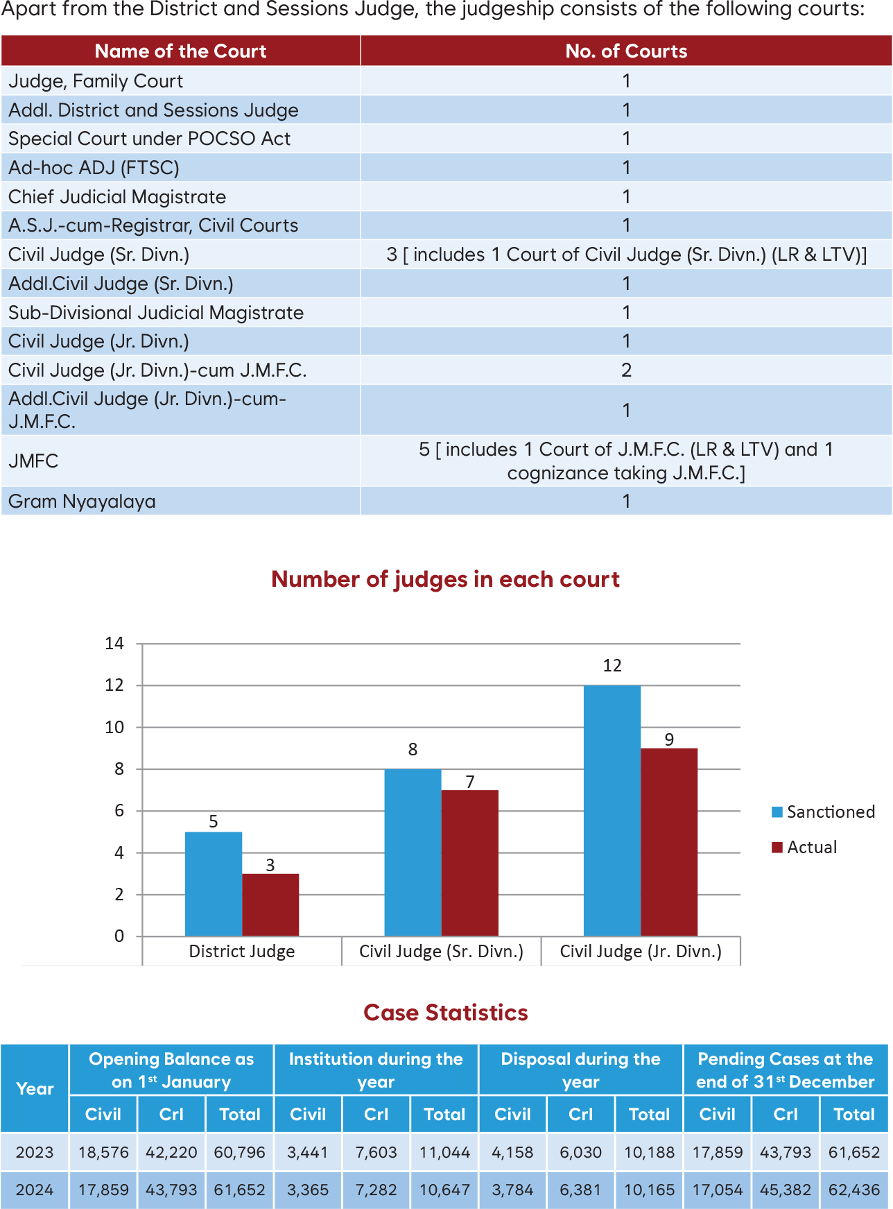 Awareness programmes were organized to combat cancer, about women issues and importance of legal support in women empowerment by involving Judicial Officers, Advocates and Court staff. The District Legal Services Authority, Kendrapara in collaboration with National Law University Odisha, Cuttack organized a workshop on Tobacco control. In the Vulnerable Witness Deposition Centre 210 witnesses and in the Virtual Court room 27 witnesses were examined in 2024.