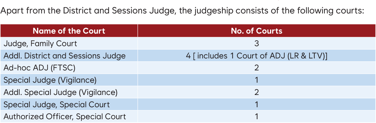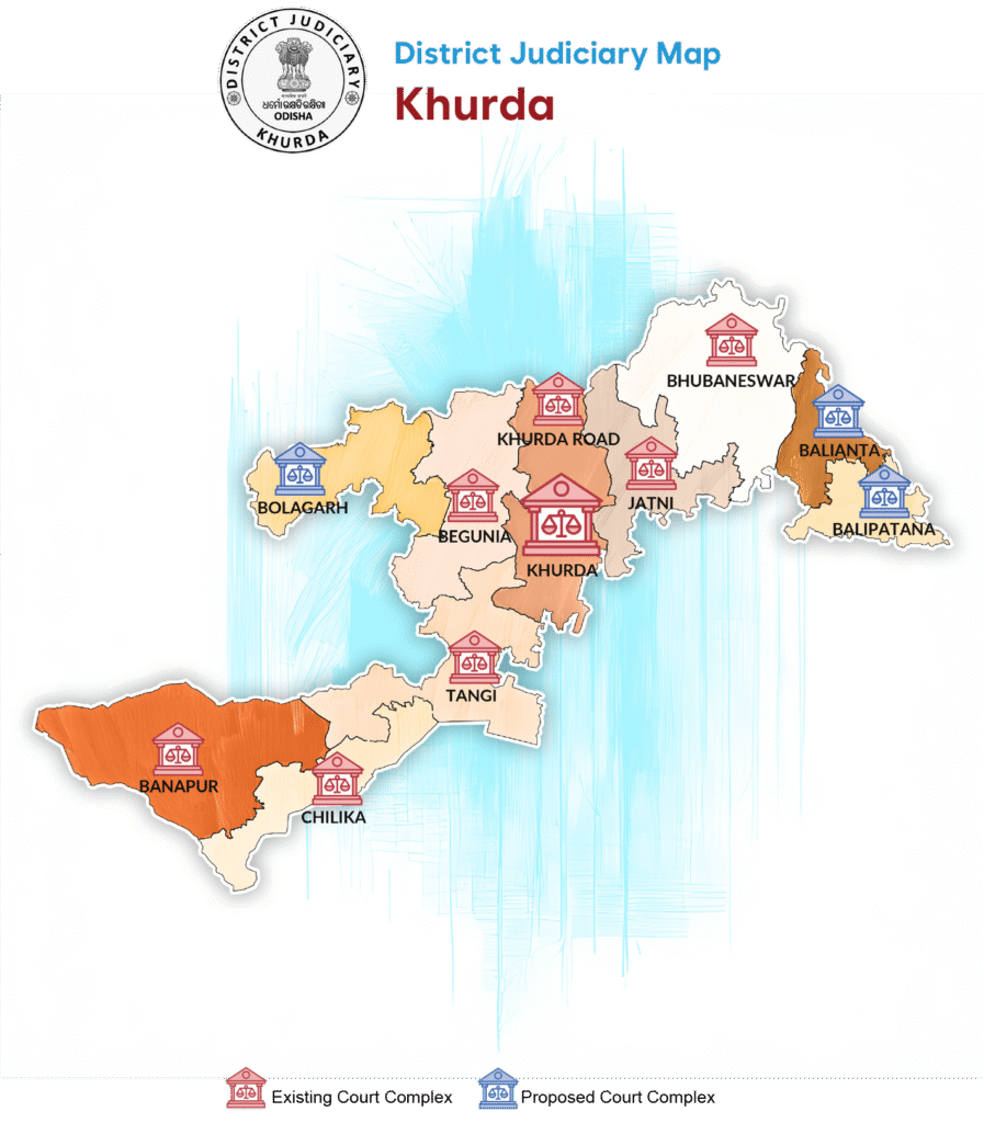 The Judgeship of Khurda was inaugurated on 1st May 1997 after being bifurcated from the Judgeship of Puri. 57 courts are functioning under it with outlying stations at Khurda, Khurda Road, Banapur, Tangi, Jatni, Chilika, and Begunia. The newly constructed Judicial Court Complex at Bhubaneswar was inaugurated on 05.12.2024 by Smt. Droupadi Murmu, Hon’ble President of India in presence of Shri Raghubar Das, Hon’ble Governor of Odisha, Justice Chakradhari Sharan Singh, Chief Justice, Justice Sangam Kumar Sahoo, Administrative Judge, Khurda Judgeship and companion judges of the High Court.
