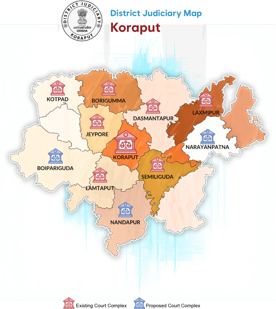 The new District Court building of the district Koraput-Jeypore was inaugurated on 10th September 2021. 31 different courts are functioning in the judgeship with outlying stations at Koraput, Semiliguda, Lamtaput, Dasmantpur, Kotpad, Borigumma, and Laxmipur.