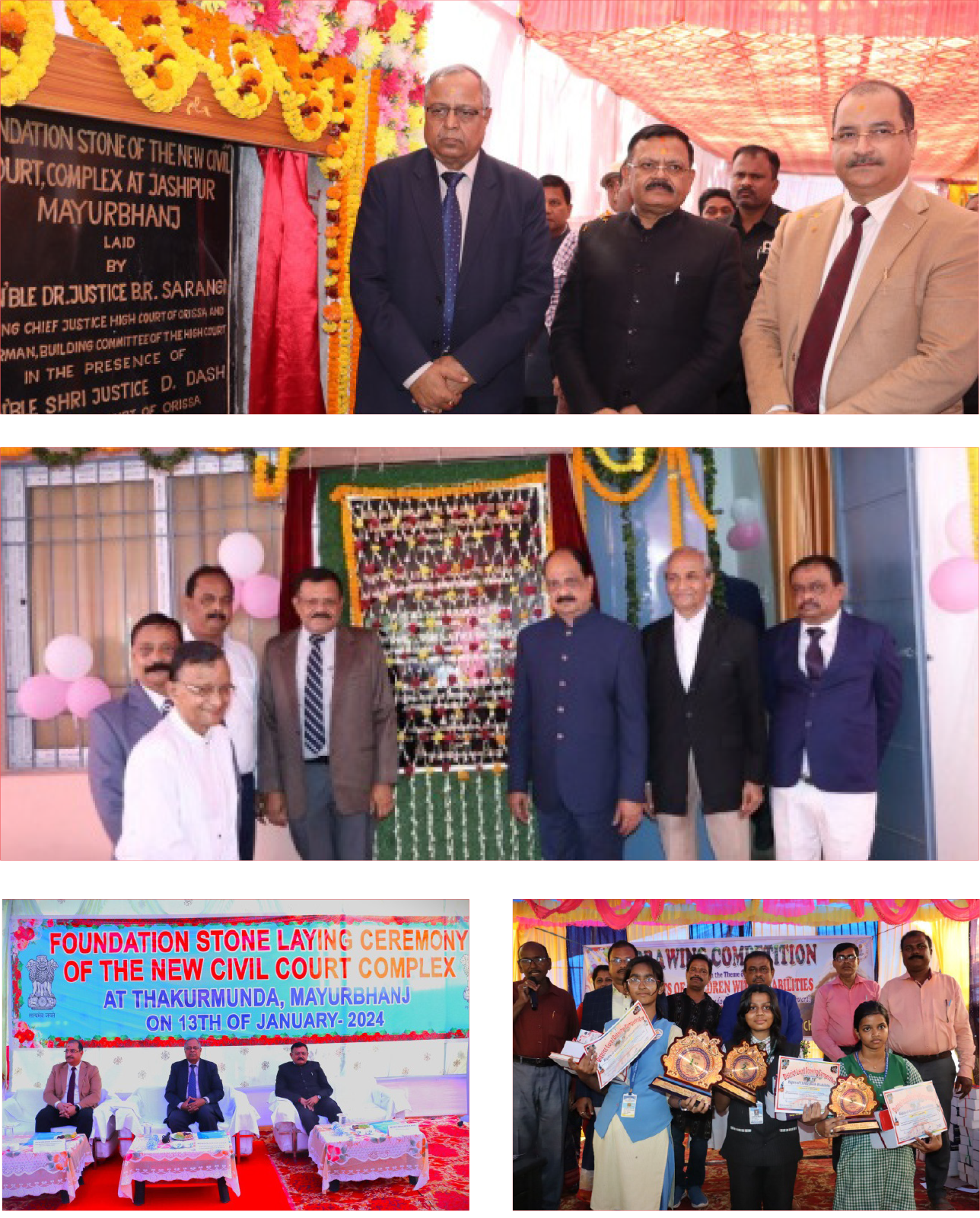 Bottom row (left to right): Laying of foundation of new civil court complex at Thakurmunda, Winners of the Drawing Competition organized on the occasion of Children’s Day.